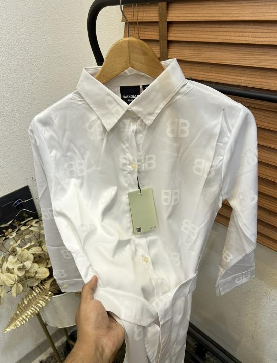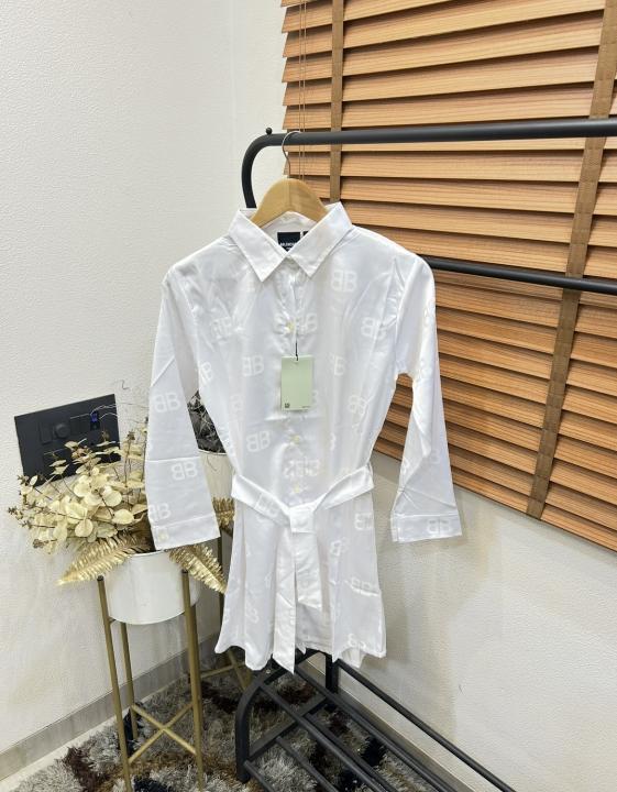 Balenciag_a Imported Silk Fabric Self Monogram Print Premium Belted Dress For Women