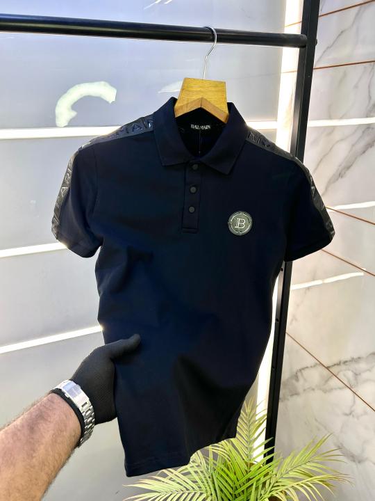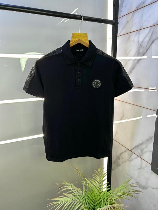 Balmai n Paris Metal Logo Imported Embossed Print Black Collar Neck T-shirt F2832-BL