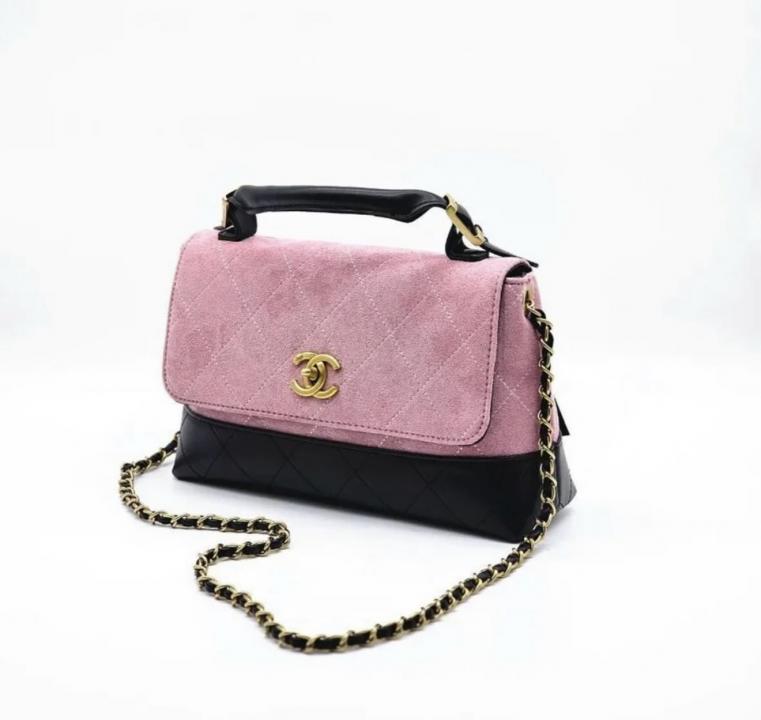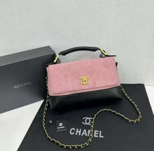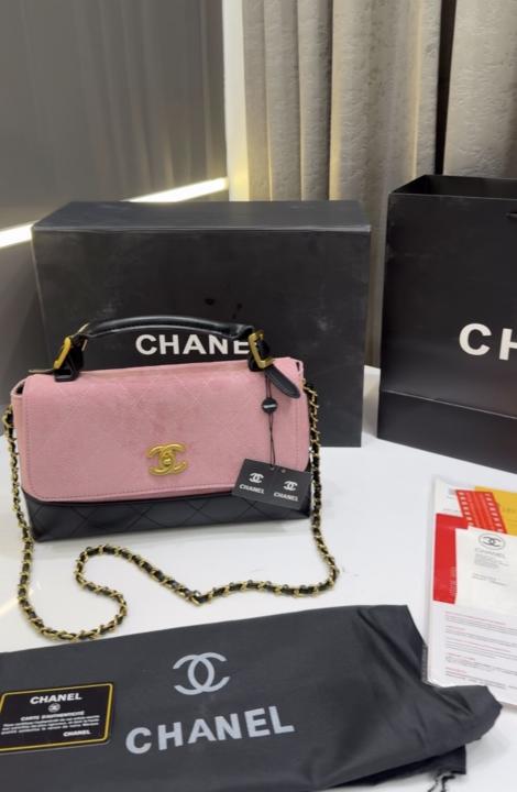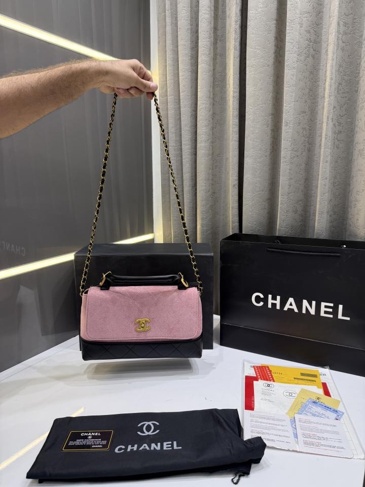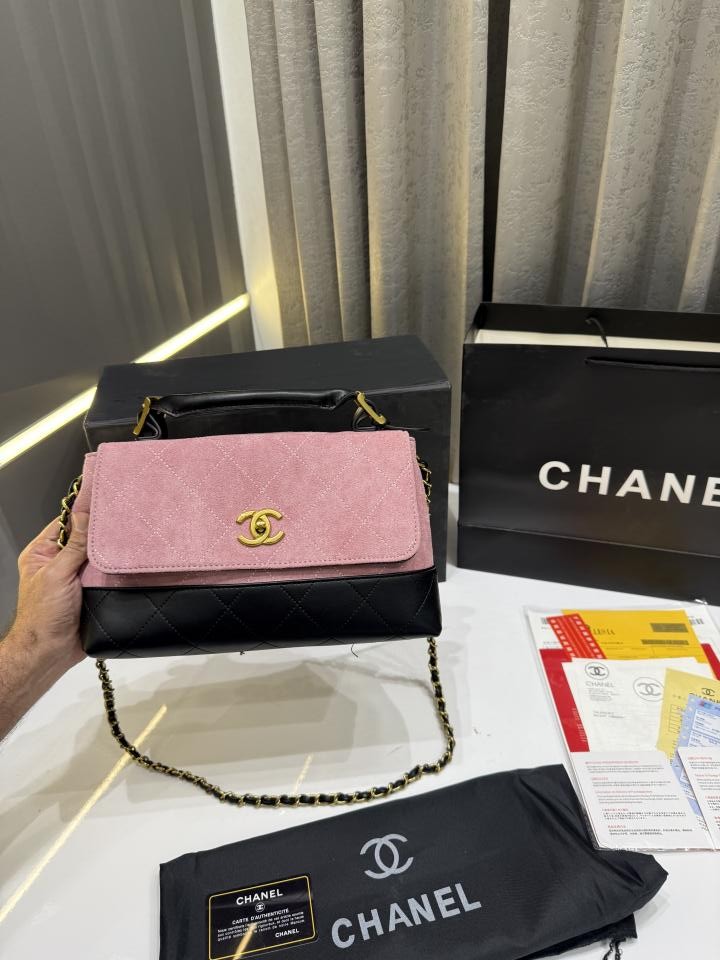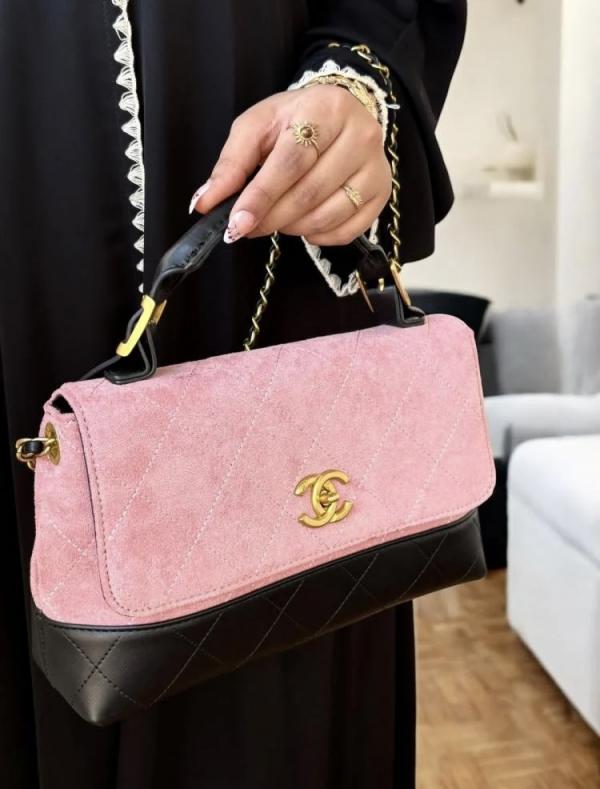 CHANE.L PINK SUEDE FLAP & BLACK LEATHER WITH PREMIUM BOX & CARRY BAG
