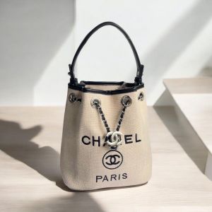 CHANE.L DRAWSTRING CHAIN BUCKET BAG BLACK LEATHER WITH SILVER TONE WITH DUST BAG