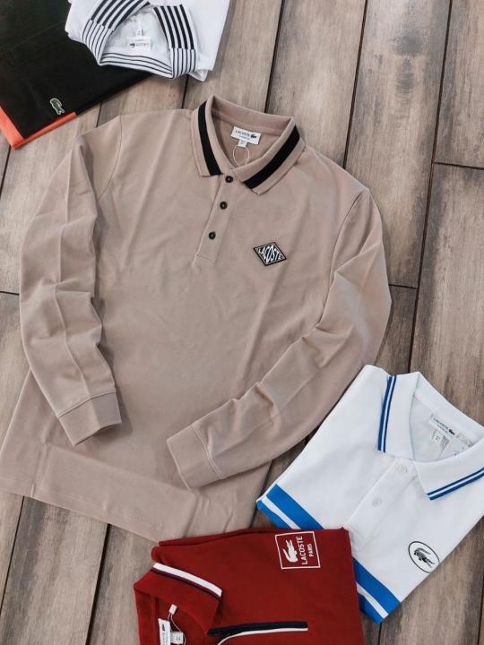 Lacost e Beige Premium Cotton Lycra Pique fabric Polo Full Sleeves Tshirt with Collar Design and Patch Logo 3292