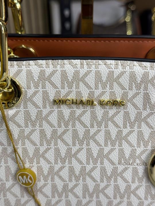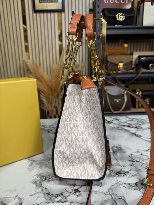 Michael_Kors Cynthia Signature Logo Satchel Bag With Box And Dust Bag Including Carry Bag (Beige)