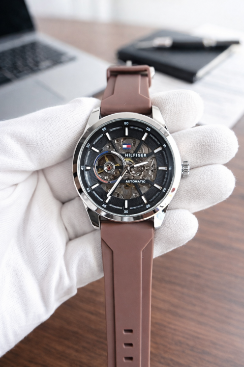 Tommy Hilfiger Automatic Silicon Belt Brown Silver Black